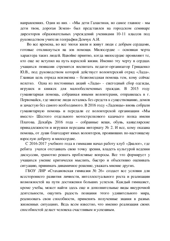 Гимназический статус ГБОУ ЛНР «Стахановская гимназия № 26» требует