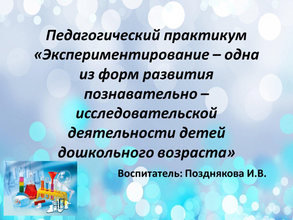 Педагогический практикум«Экспериментирование – одна из форм развития познавательно – исследовательской деятельности детей дошкольного возраста» Воспитатель: Позднякова И.В.