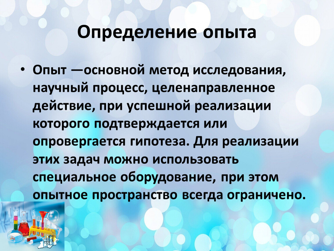 Опыт —основной метод исследования, научный процесс, целенаправленное действие, при успешной реализации которого подтверждается или опровергается гипотеза. Для реализации этих задач можно использовать специальное оборудование, при этом опытное пространство всегда ограничено.