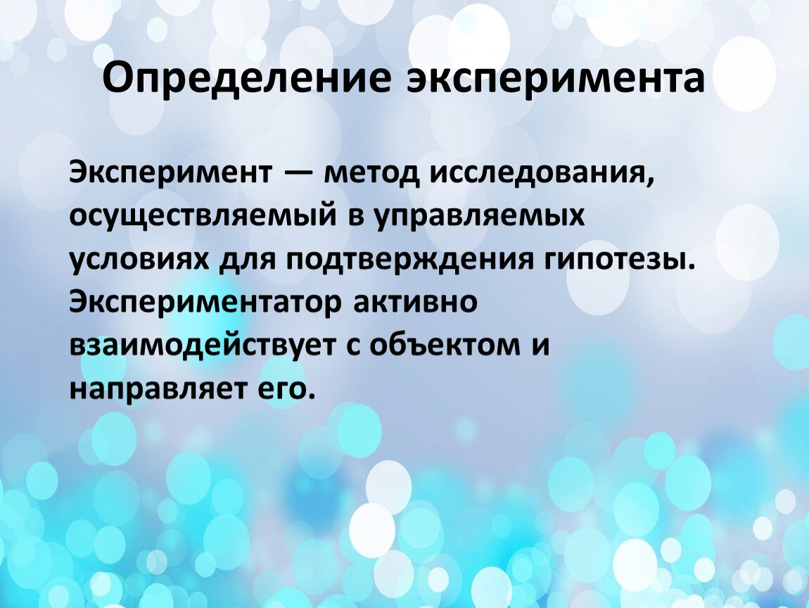 Эксперимент — метод исследования, осуществляемый в управляемых условиях для подтверждения гипотезы. Экспериментатор активно взаимодействует с объектом и направляет его.