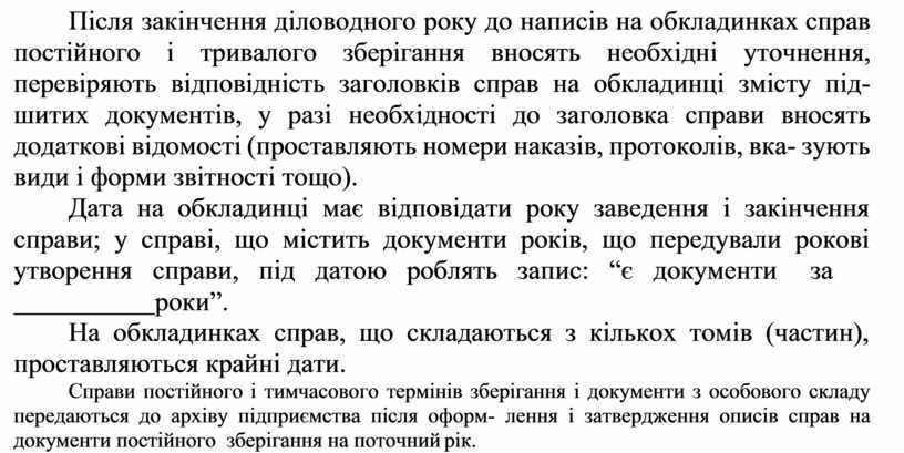 Після закінчення діловодного року до написів на обкладинках справ постійного і тривалого зберігання вносять необхідні уточнення, перевіряють відповідність заголовків справ на обкладинці змісту під- шитих документів, у разі необхідності до заголовка справи вносять додаткові відомості (проставляють номери наказів, протоколів, вка- зують види і форми звітності тощо).