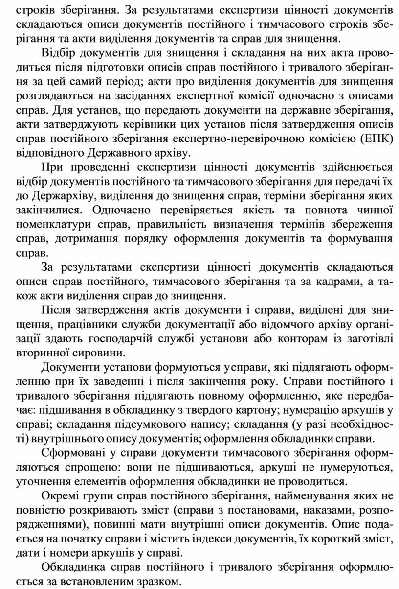 строків зберігання. За результатами експертизи цінності документів складаються описи документів постійного і тимчасового строків збе- рігання та акти виділення документів та справ для знищення.