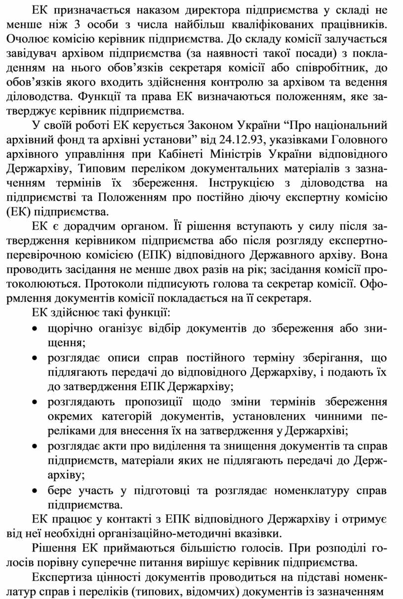 У своїй роботi ЕК керується Законом України “Про нацiональний архiвний фонд та архiвнi установи” вiд 24.12.93, указiвками Головного архiвного управлiння при Кабiнетi Мiнiстрiв України вiдповiдного Держархiву, Типовим перелiком документальних матерiалiв з зазна- ченням термiнiв їх збереження. Iнструкцiєю з дiловодства на пiдприємствi та Положенням про постiйно дiючу експертну комiсiю (ЕК) пiдприємства.