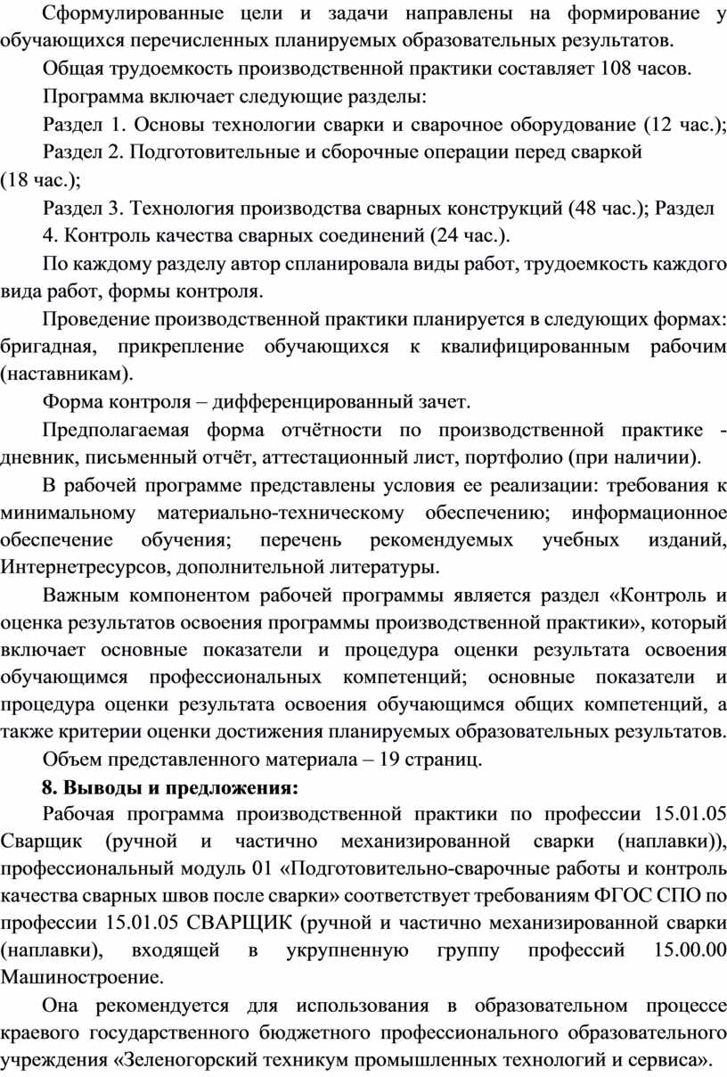 Рабочая программа производственной практики по профессиональному модулю 01 разработана на основе ФГОС СПО по профессии 15.01.05 СВАРЩИК (ручной и частично механизированной сварки (наплавки)), входящей в укрупненную группу профессий 15.00.00 Машиностроение.