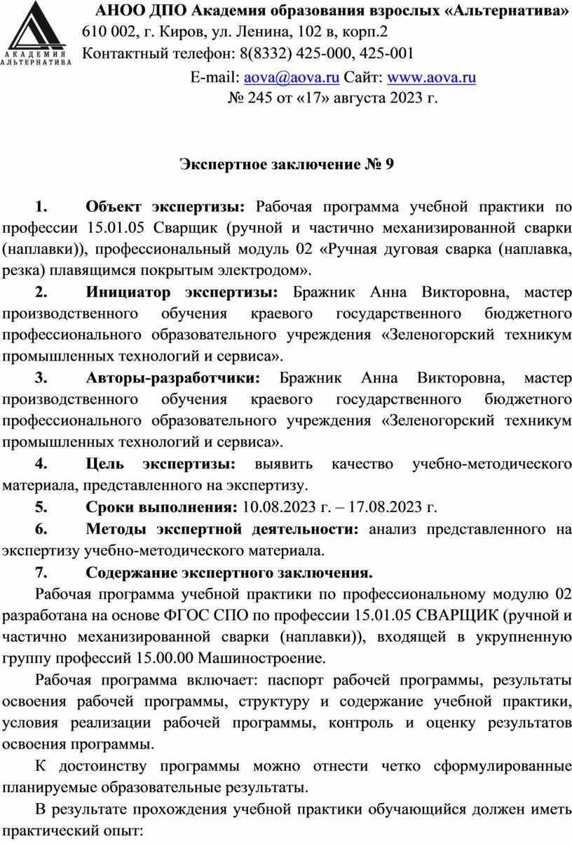 1. Объект экспертизы: Рабочая программа учебной практики по профессии 15.01.05 Сварщик (ручной и частично механизированной сварки (наплавки)), профессиональный модуль 02 «Ручная дуговая сварка (наплавка, резка) плавящимся покрытым электродом».