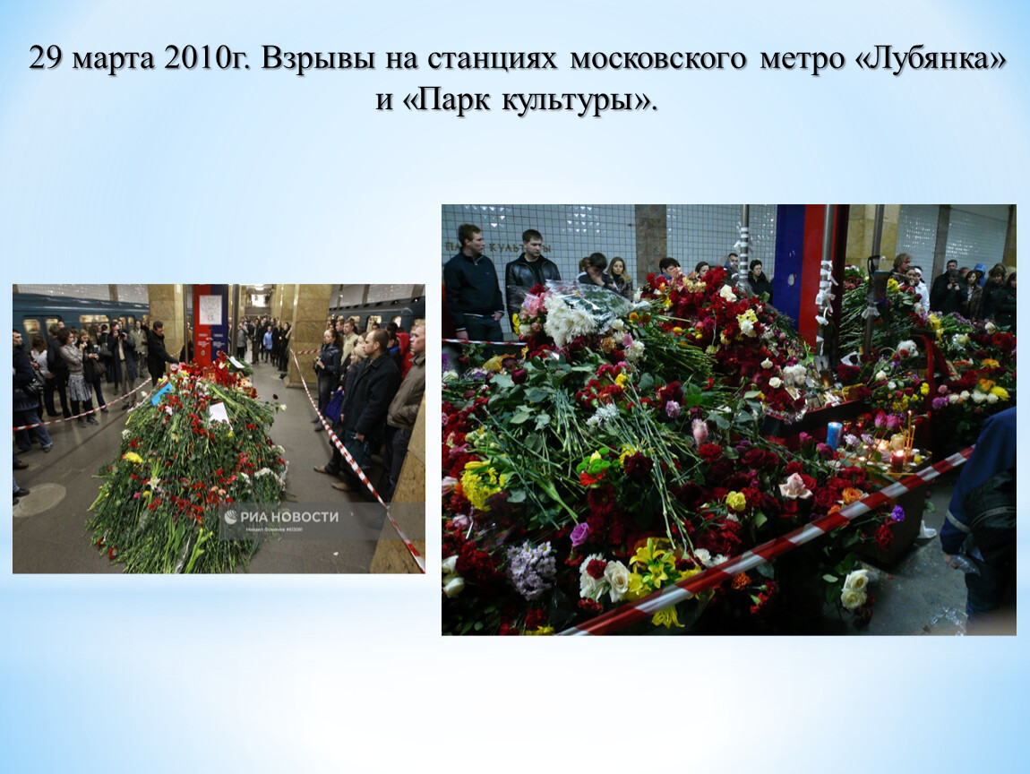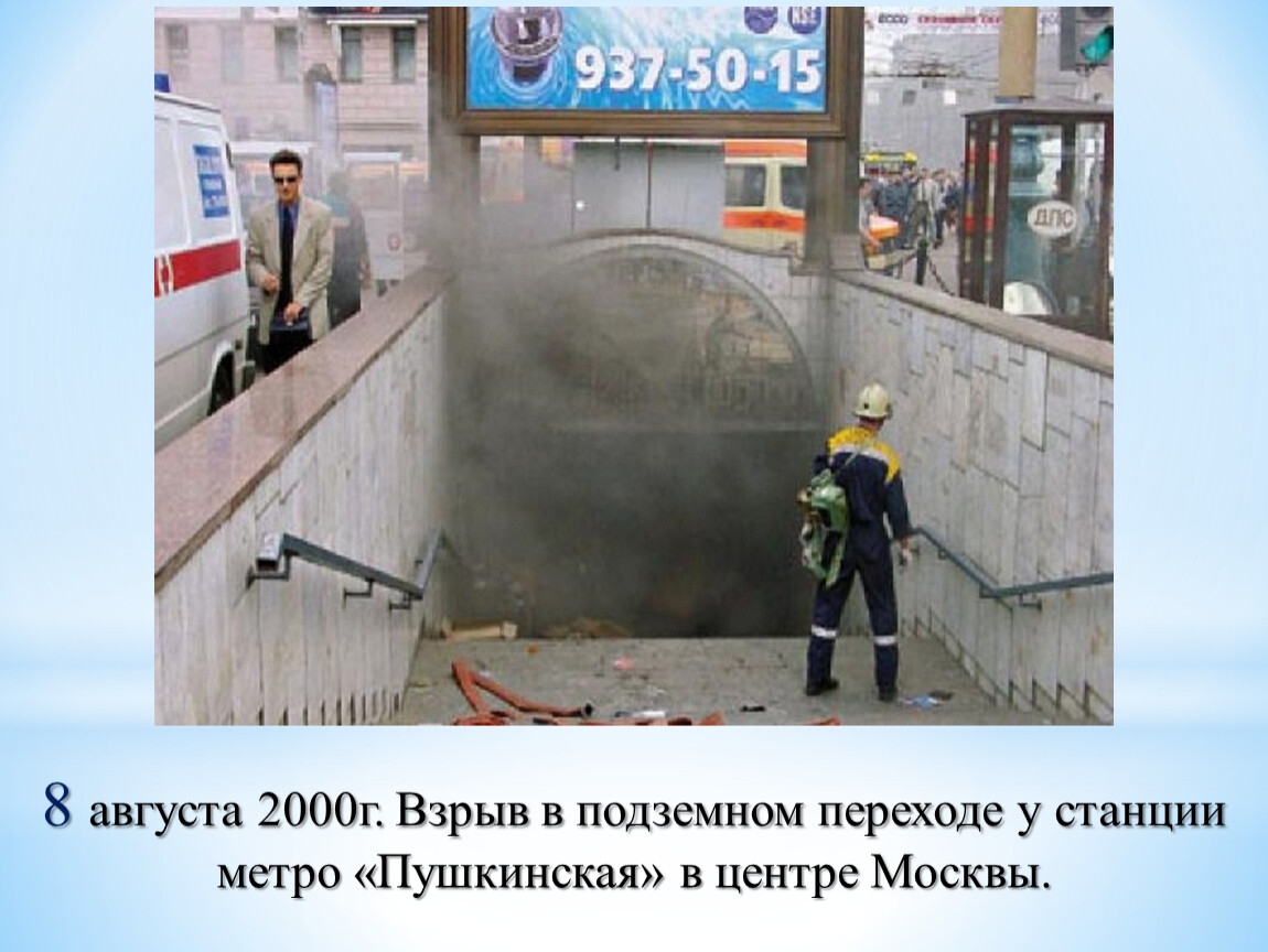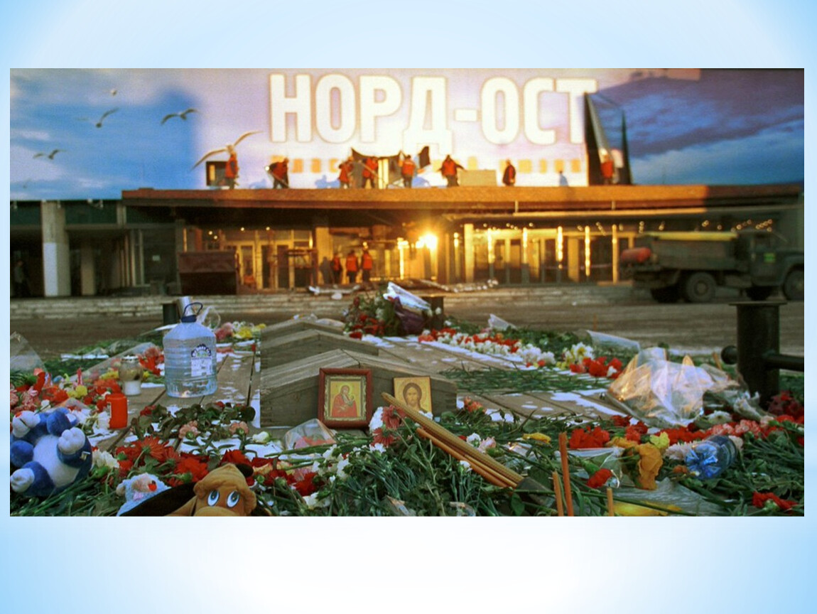 23 октября 2002г. – Норд-Ост Захват более 900 человек в московском Театральном центре на Дубровке чеченскими сепаратистами.