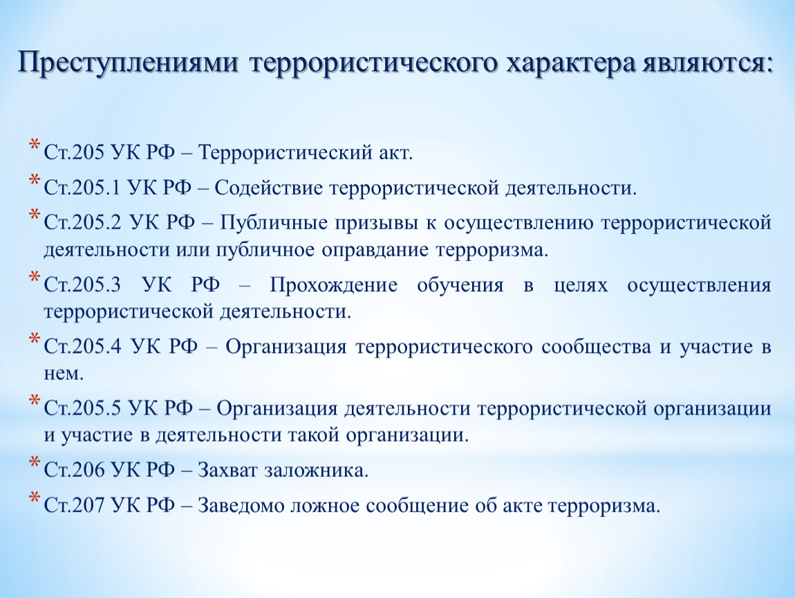 Ст.205.2 УК РФ – Публичные призывы к осуществлению террористической деятельности или публичное оправдание терроризма.