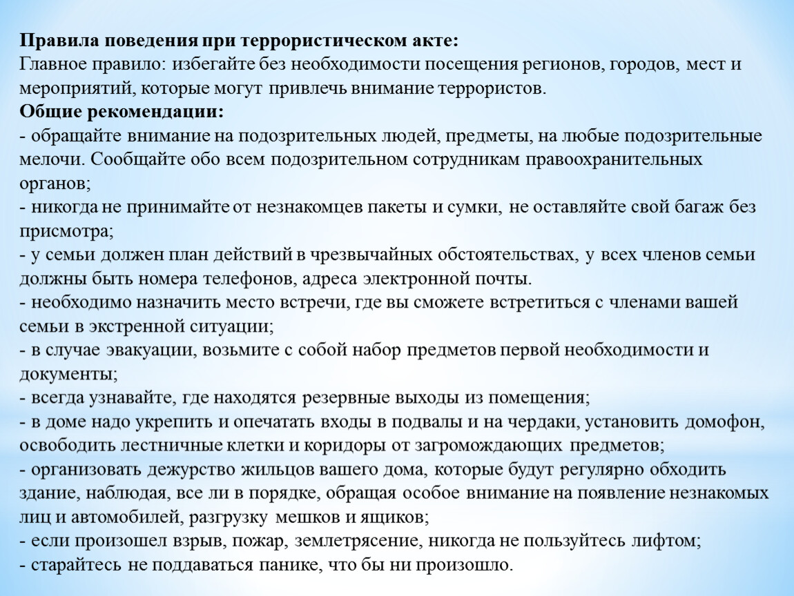 - при необходимости выполняйте требования преступников, не противоречьте им, не рискуйте жизнью окружающих и своей собственной. Старайтесь не допускать истерик и паники;