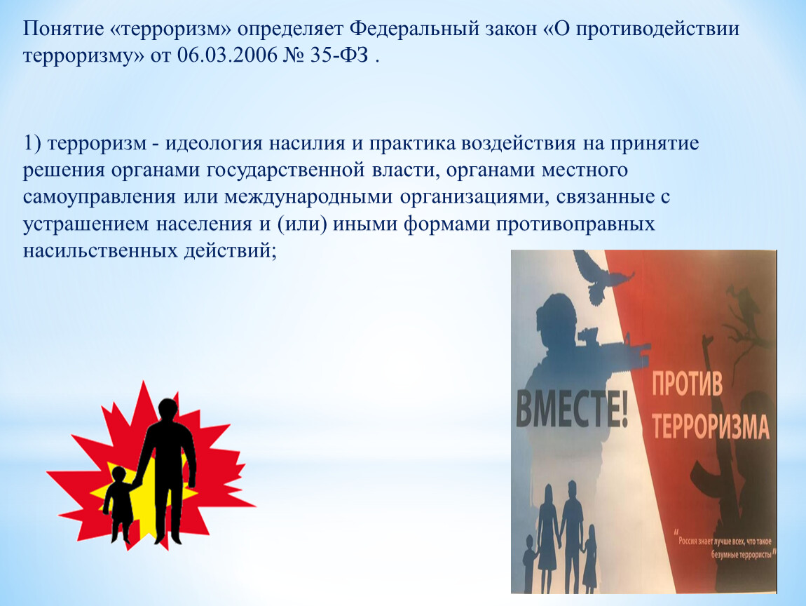 Понятие «терроризм» определяет Федеральный закон «О противодействии терроризму» от 06.03.2006 № 35-ФЗ .
