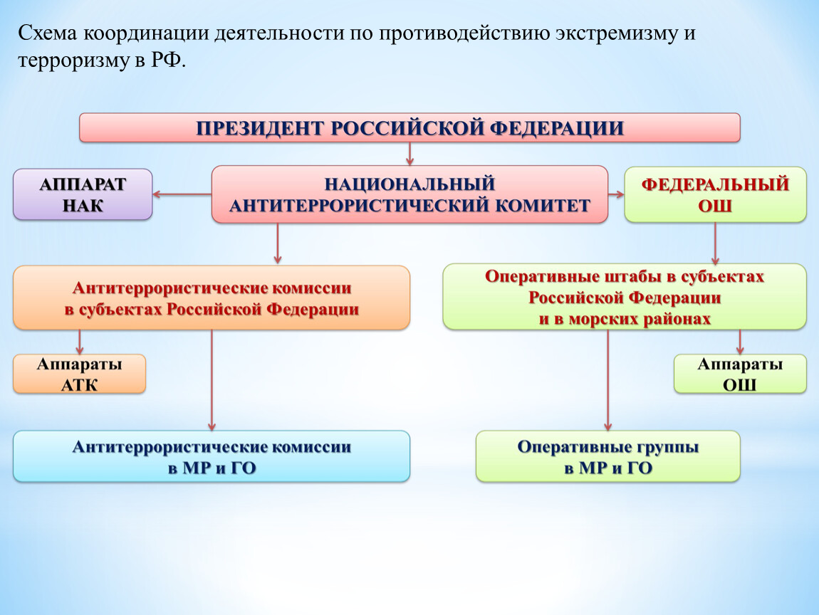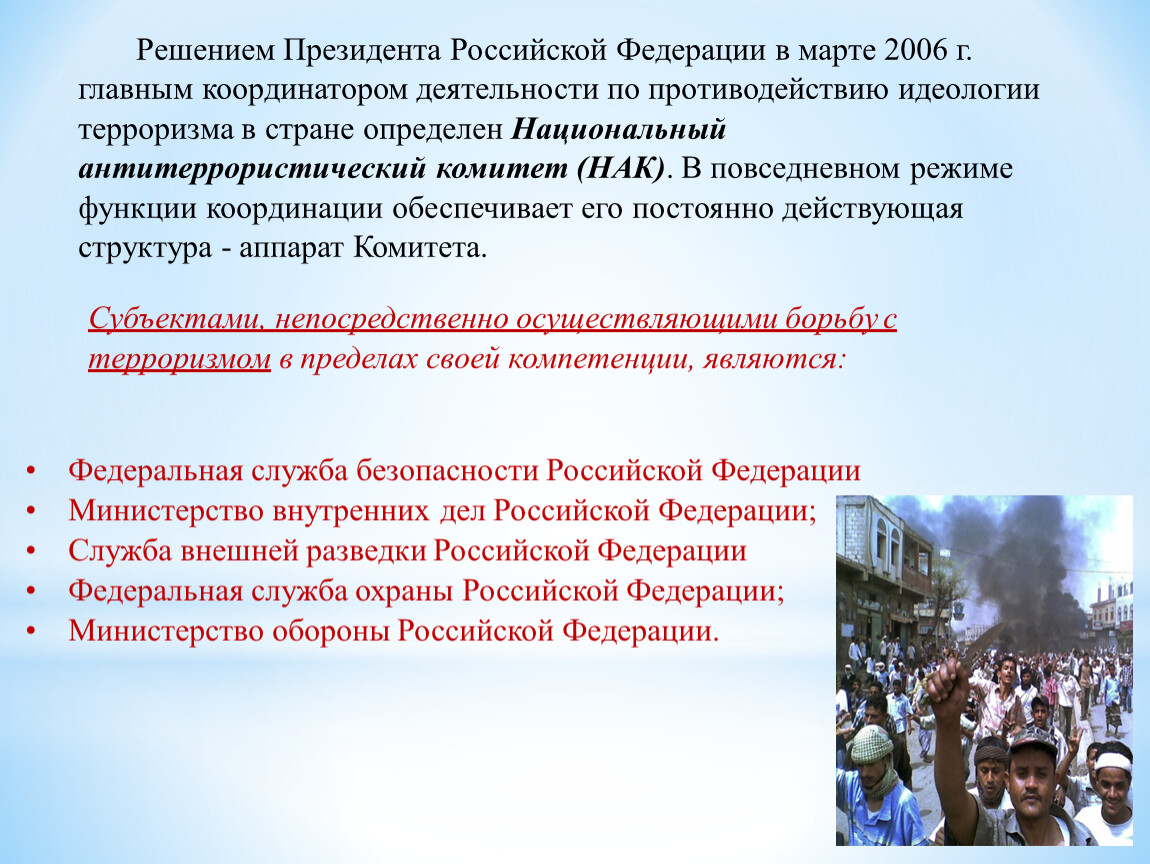 Решением Президента Российской Федерации в марте 2006 г. главным координатором деятельности по противодействию идеологии терроризма в стране определен Национальный антитеррористический комитет (НАК). В повседневном режиме функции координации обеспечивает его постоянно действующая структура - аппарат Комитета.