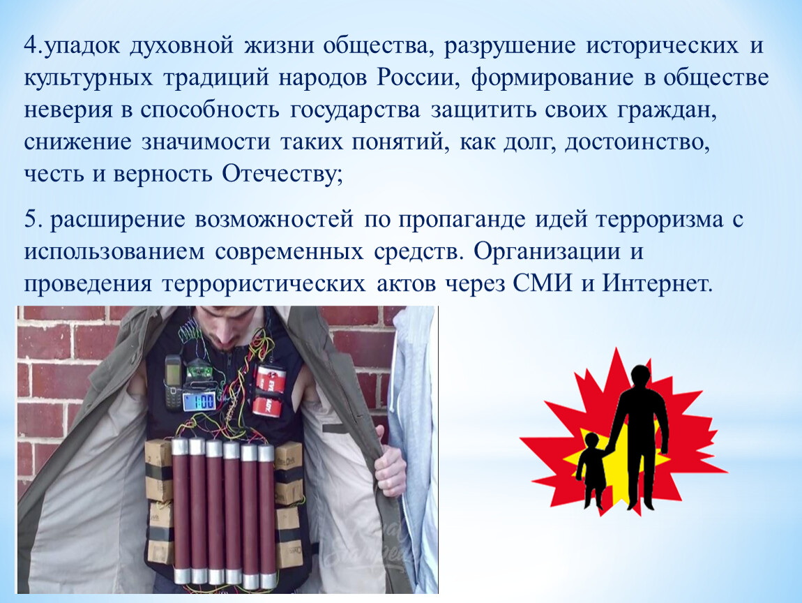 4.упадок духовной жизни общества, разрушение исторических и культурных традиций народов России, формирование в обществе неверия в способность государства защитить своих граждан, снижение значимости таких понятий, как долг, достоинство, честь и верность Отечеству;