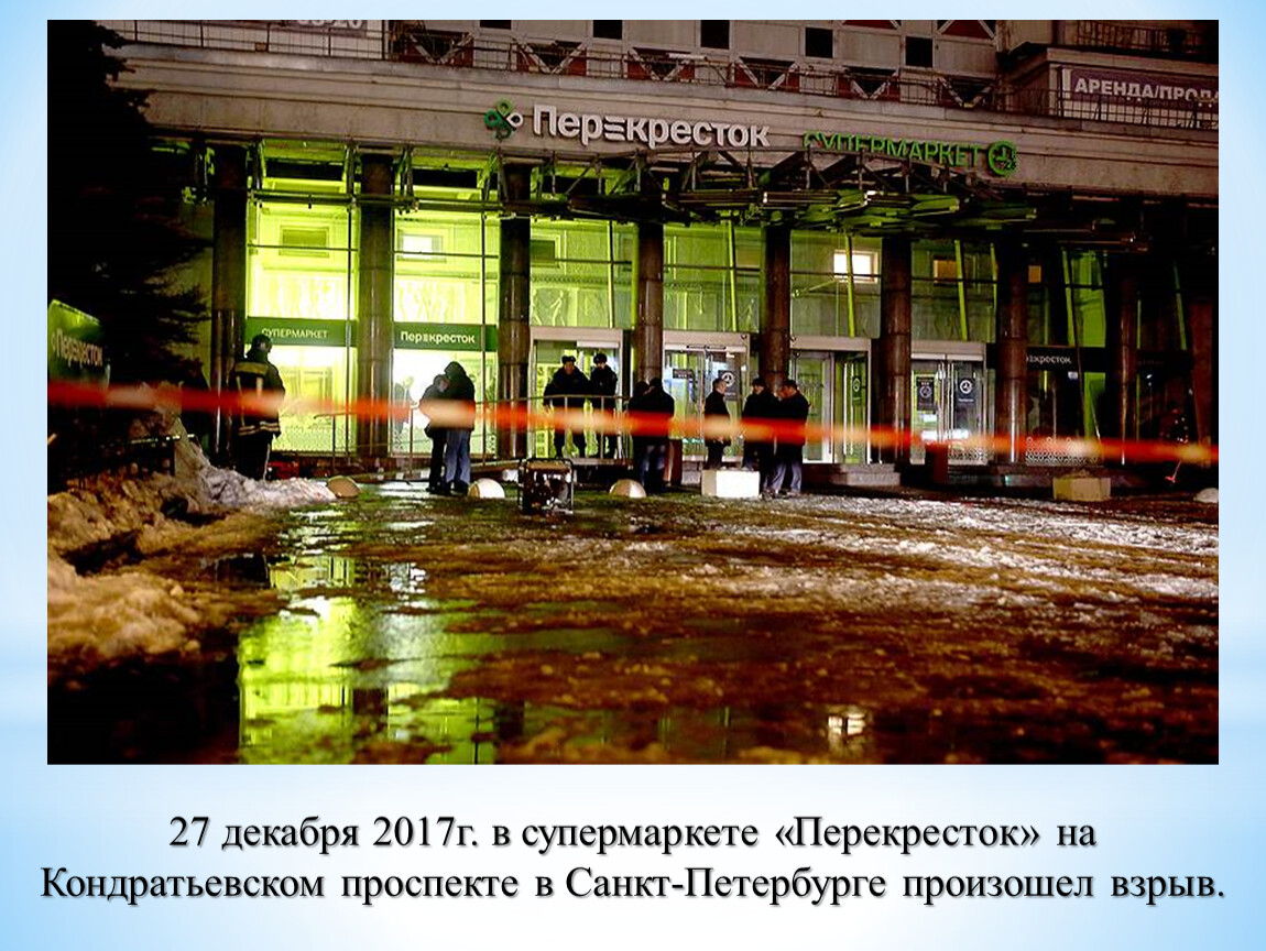 27 декабря 2017г. в супермаркете «Перекресток» на Кондратьевском проспекте в Санкт-Петербурге произошел взрыв.