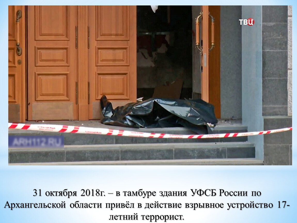 31 октября 2018г. – в тамбуре здания УФСБ России по Архангельской области привёл в действие взрывное устройство 17-летний террорист.