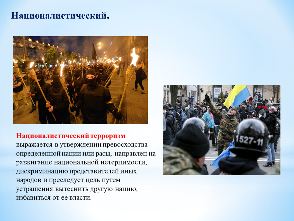 Националистический терроризм выражается в утверждении превосходства определенной нации или расы, направлен на разжигание национальной нетерпимости, дискриминацию представителей иных народов и преследует цель путем устрашения вытеснить другую нацию, избавиться от ее власти.