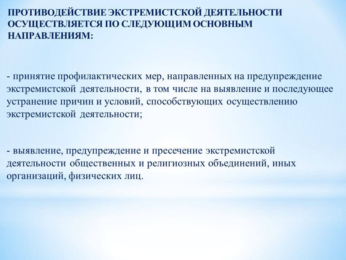 Противодействие экстремистской деятельности осуществляется по следующим основным направлениям: