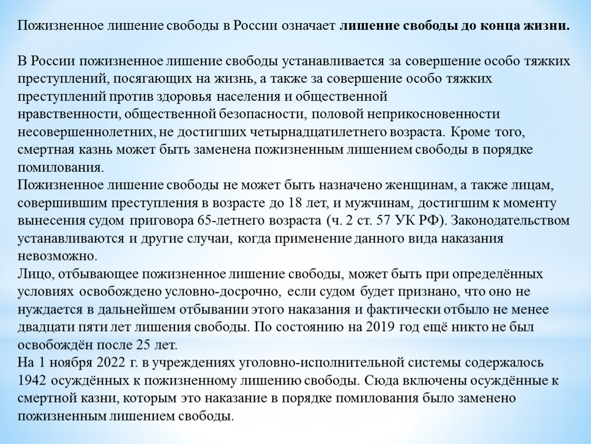 На 1 ноября 2022 г. в учреждениях уголовно-исполнительной системы содержалось 1942 осуждённых к пожизненному лишению свободы. Сюда включены осуждённые к смертной казни, которым это наказание в порядке помилования было заменено пожизненным лишением свободы.