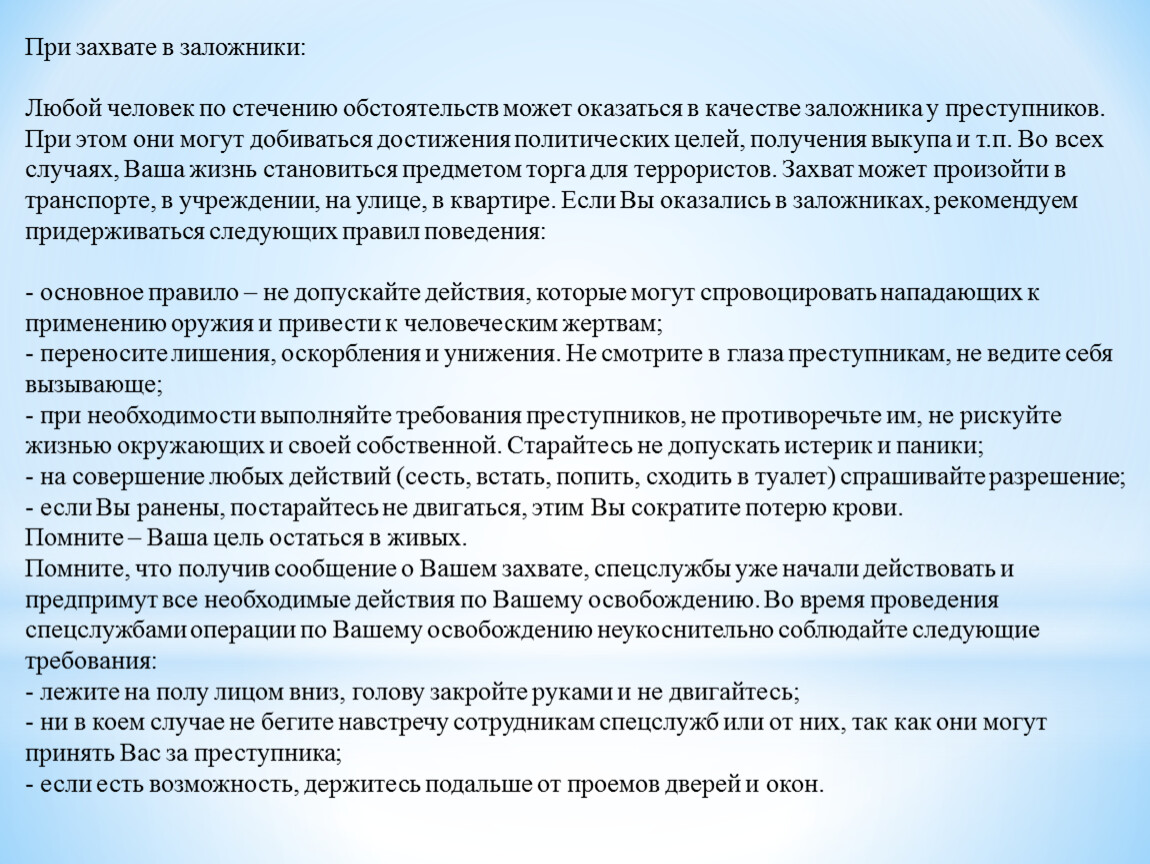 Любой человек по стечению обстоятельств может оказаться в качестве заложника у преступников. При этом они могут добиваться достижения политических целей, получения выкупа и т.п. Во всех случаях, Ваша жизнь становиться предметом торга для террористов. Захват может произойти в транспорте, в учреждении, на улице, в квартире. Если Вы оказались в заложниках, рекомендуем придерживаться следующих правил поведения: