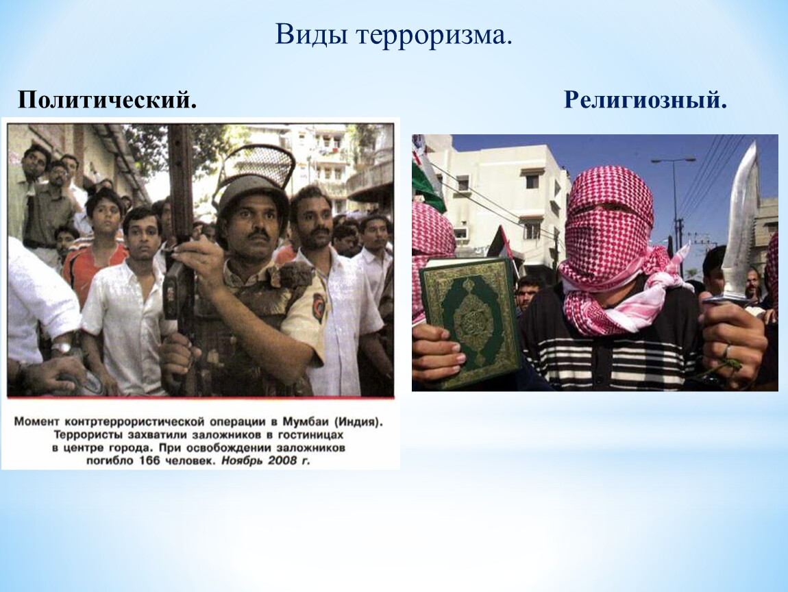 1) терроризм - идеология насилия и практика воздействия на принятие решения органами государственной власти, органами местного самоуправления или международными организациями, связанные с устрашением населения и (или) иными формами противоправных насильственных действий;