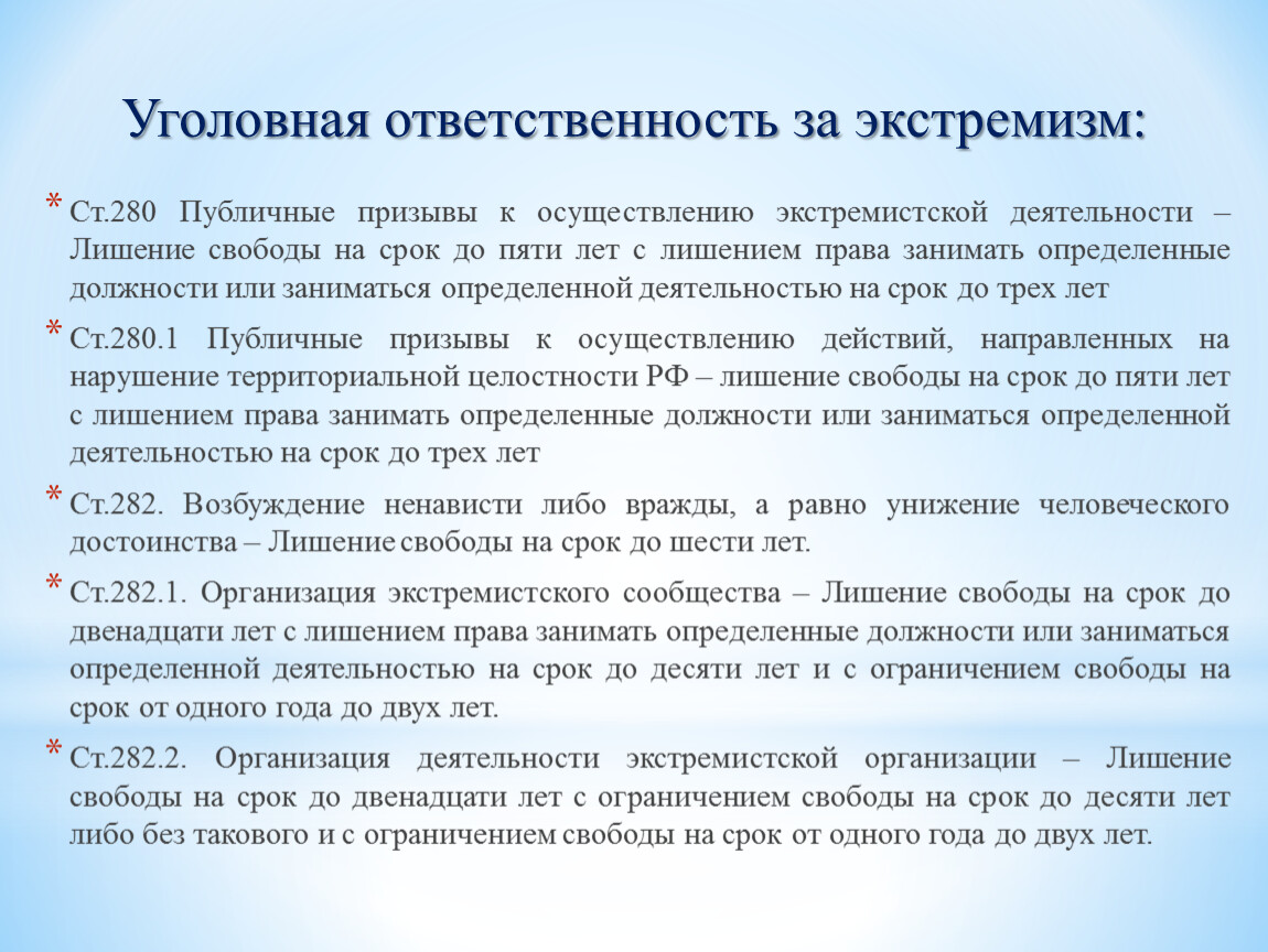 Ст.280 Публичные призывы к осуществлению экстремистской деятельности – Лишение свободы на срок до пяти лет с лишением права занимать определенные должности или заниматься определенной деятельностью на срок до трех лет