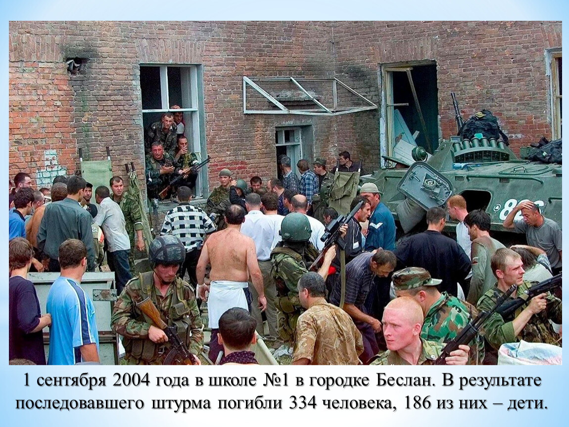 1 сентября 2004 года в школе №1 в городке Беслан. В результате последовавшего штурма погибли 334 человека, 186 из них – дети.