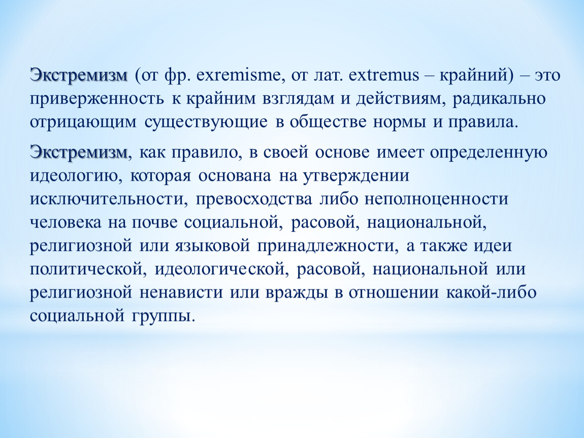 Экстремизм (от фр. exremisme, от лат. extremus – крайний) – это приверженность к крайним взглядам и действиям, радикально отрицающим существующие в обществе нормы и правила.
