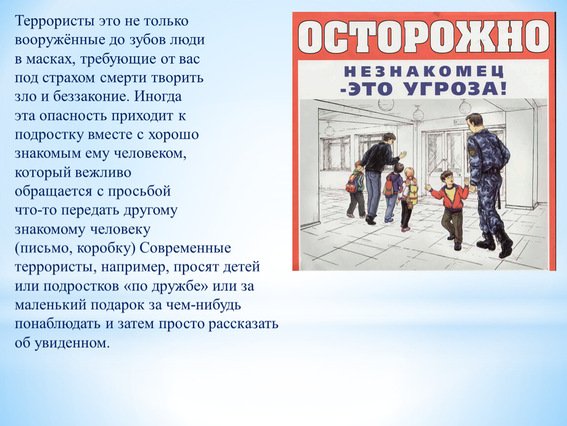 (письмо, коробку) Современные террористы, например, просят детей или подростков «по дружбе» или за маленький подарок за чем-нибудь понаблюдать и затем просто рассказать об увиденном.