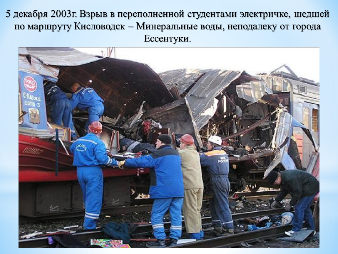 5 декабря 2003г. Взрыв в переполненной студентами электричке, шедшей по маршруту Кисловодск – Минеральные воды, неподалеку от города Ессентуки.