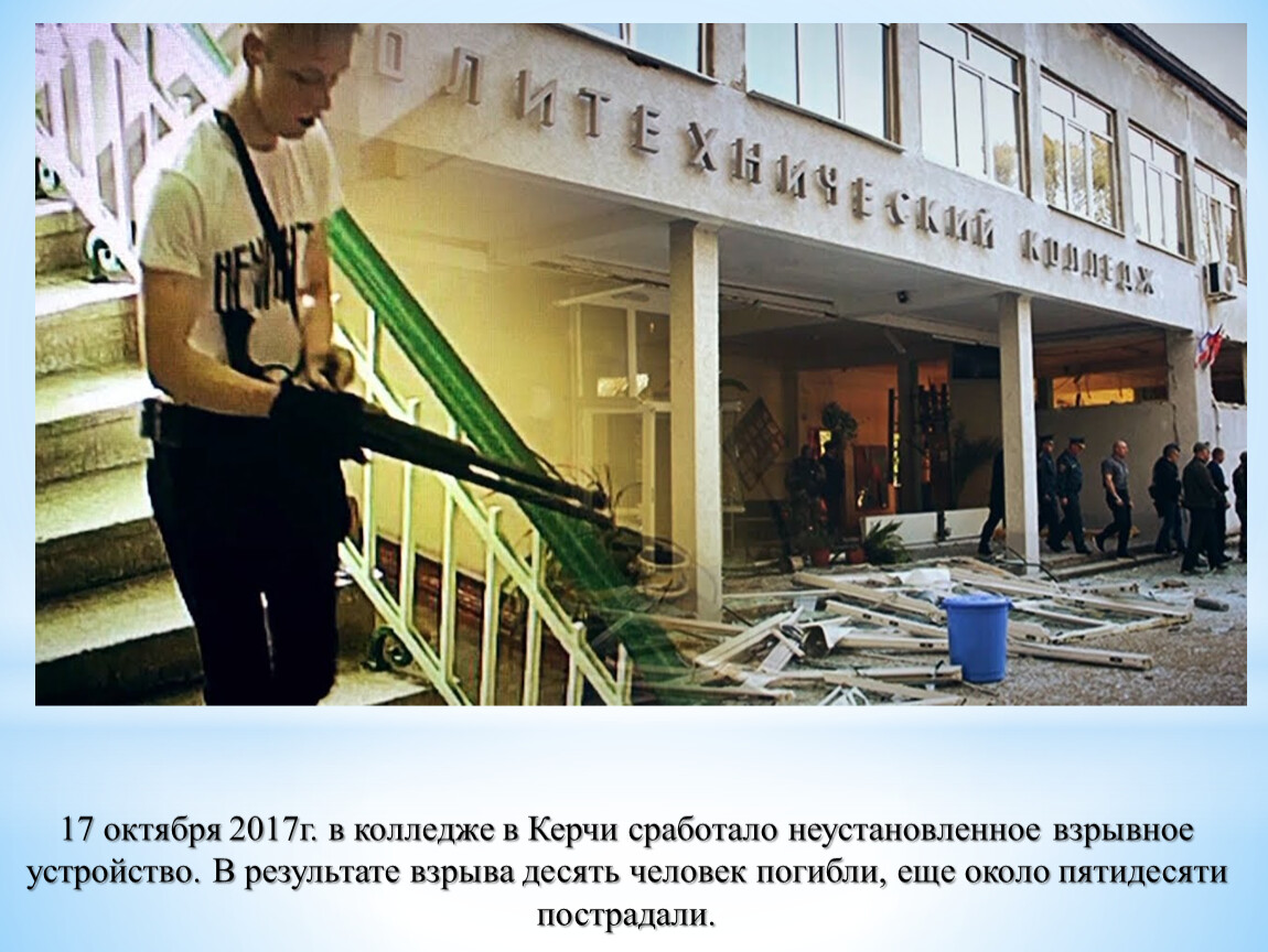 17 октября 2017г. в колледже в Керчи сработало неустановленное взрывное устройство. В результате взрыва десять человек погибли, еще около пятидесяти пострадали.