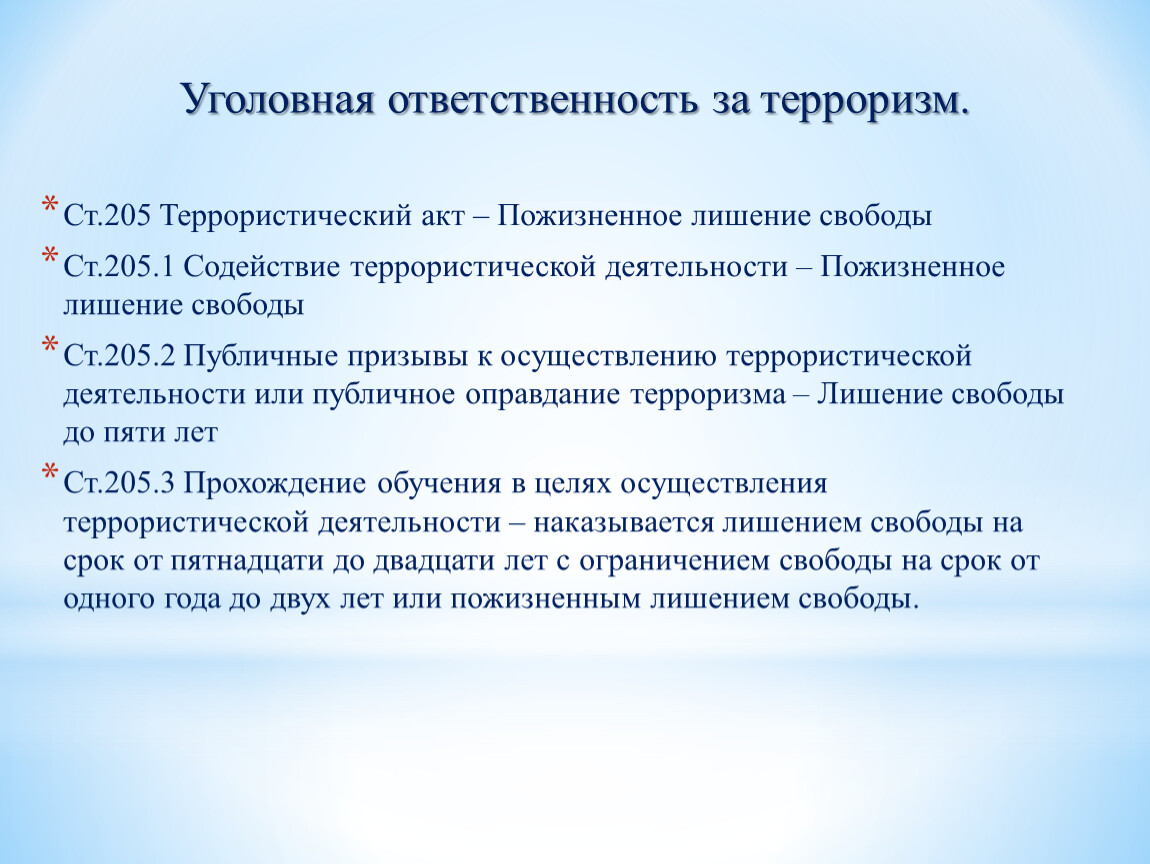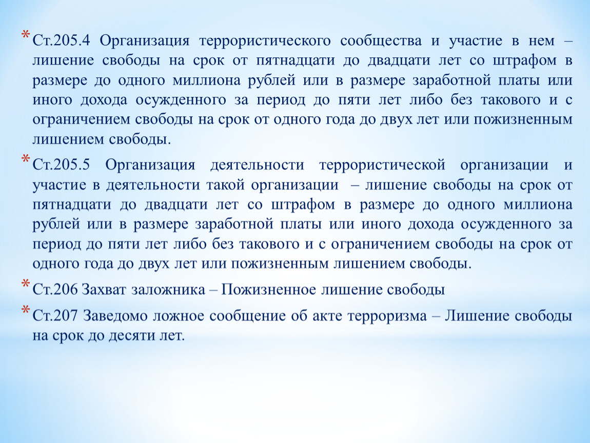 Ст.205.2 Публичные призывы к осуществлению террористической деятельности или публичное оправдание терроризма – Лишение свободы до пяти лет