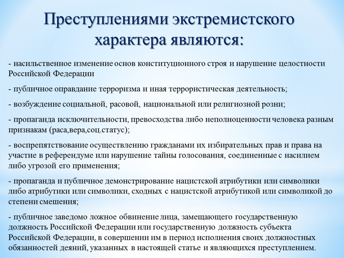 - публичное оправдание терроризма и иная террористическая деятельность;