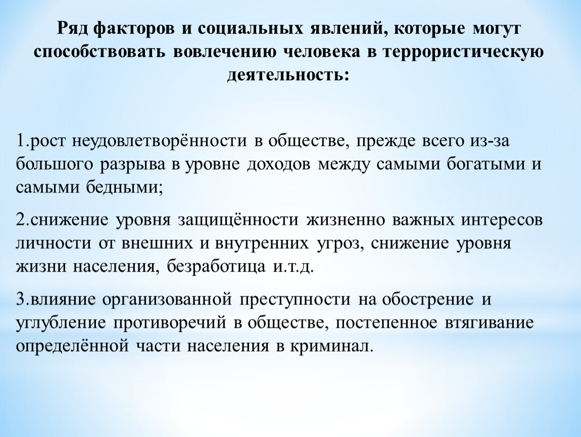Ряд факторов и социальных явлений, которые могут способствовать вовлечению человека в террористическую деятельность: