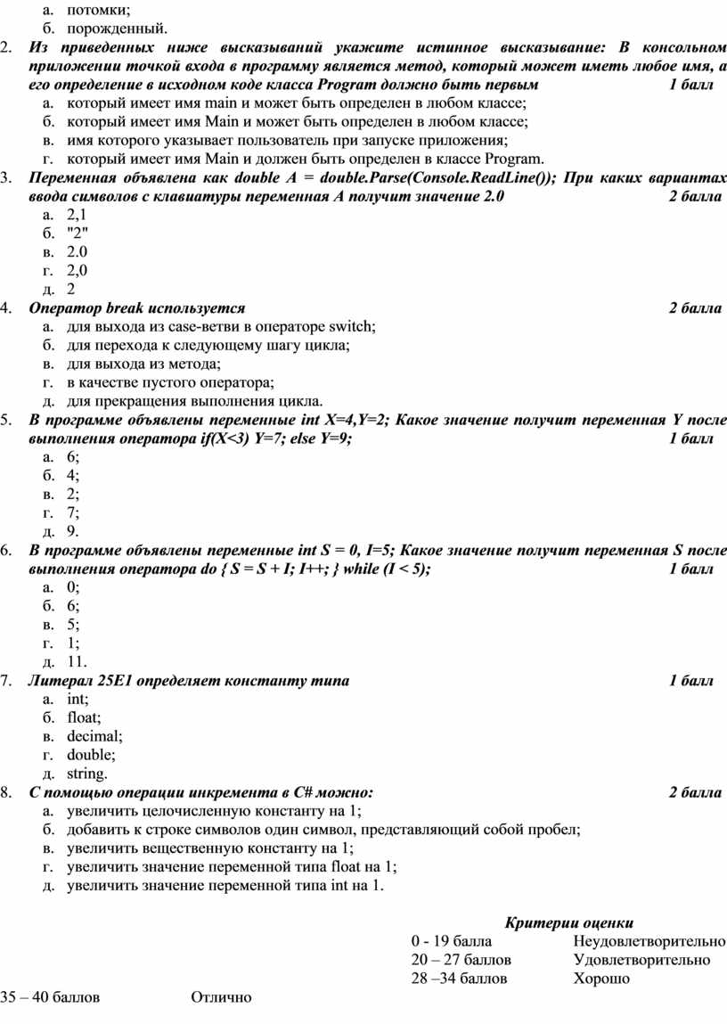 25. Переменная объявлена как double A = double.Parse(Console.ReadLine()); При каких вариантах ввода символов с клавиатуры переменная A получит значение 2.0 2 балла