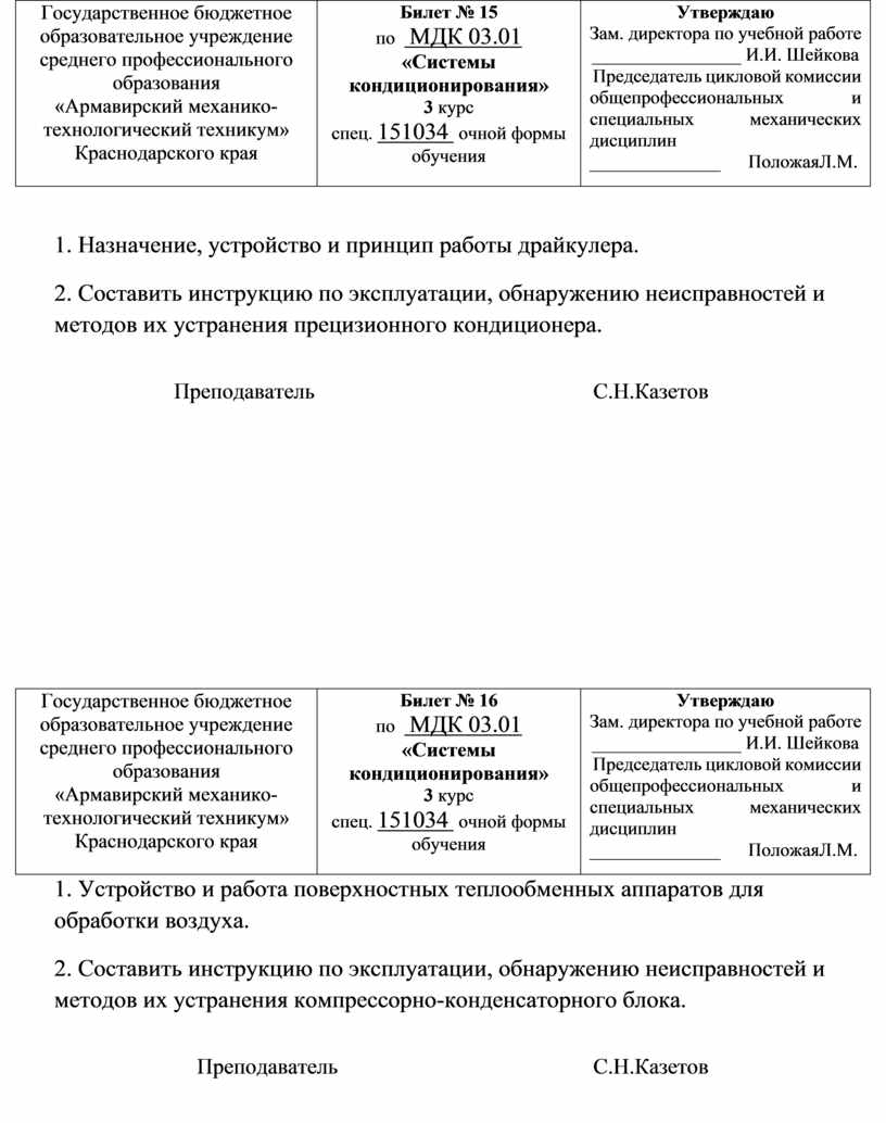 Билет № 15 по МДК 03.01 «Системы кондиционирования» 3 курс спец. 151034 очной формы обучения