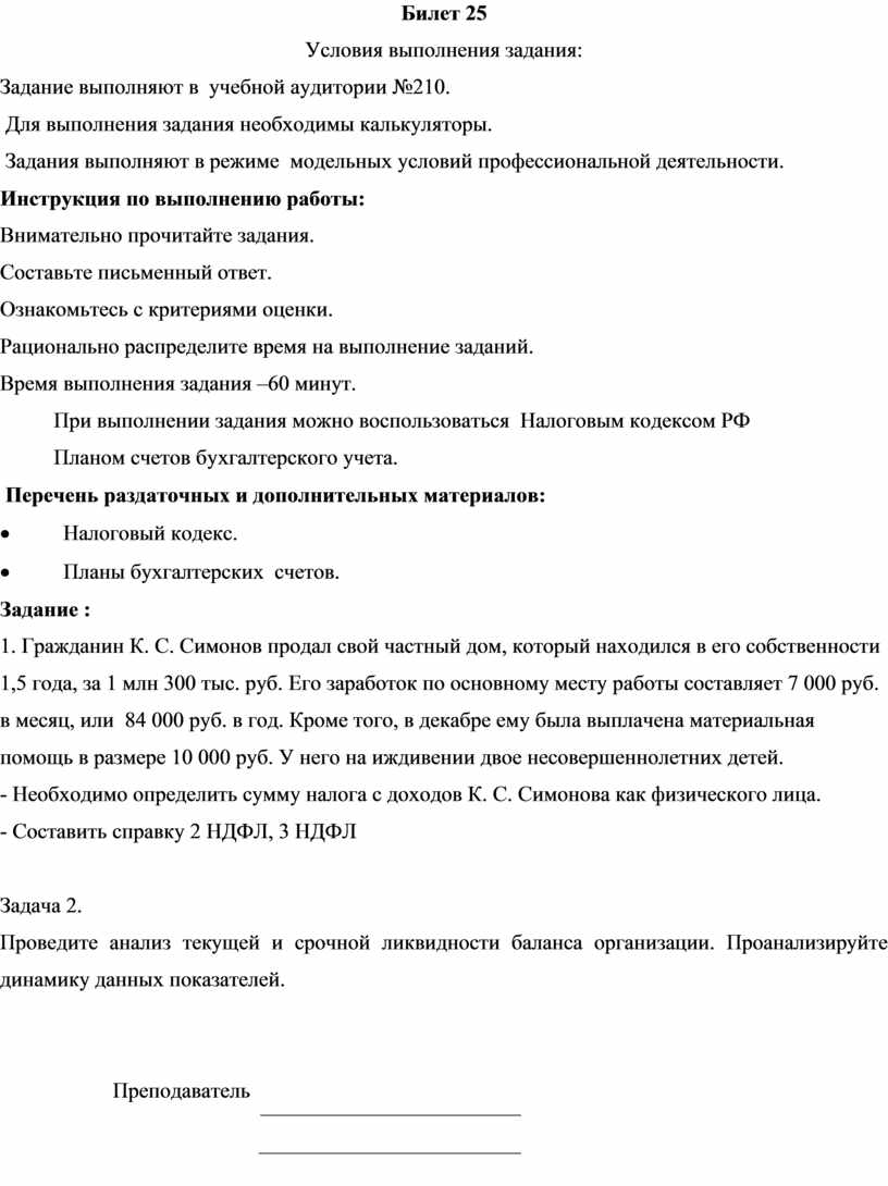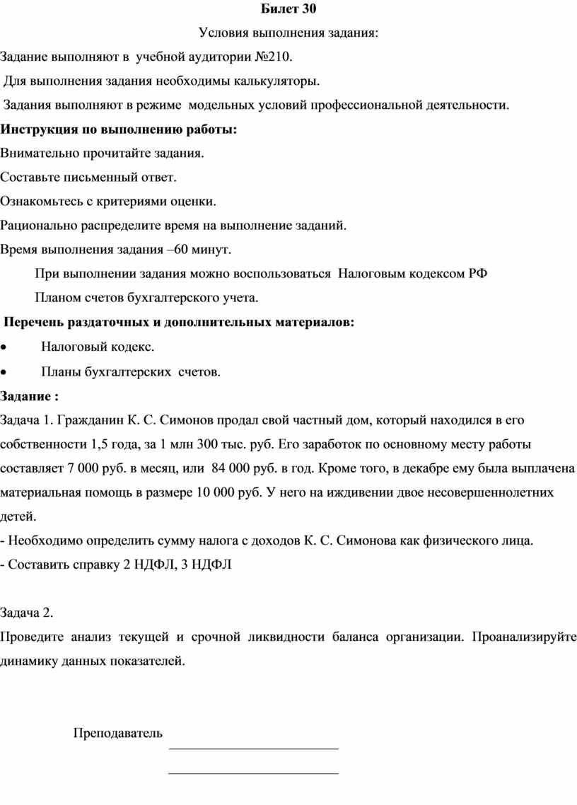 Задача 1. Гражданин К. С. Симонов продал свой частный дом, который находился в его собственности 1,5 года, за 1 млн 300 тыс. руб. Его заработок по основному месту работы составляет 7 000 руб. в месяц, или 84 000 руб. в год. Кроме того, в декабре ему была выплачена материальная помощь в размере 10 000 руб. У него на иждивении двое несовершеннолетних детей.