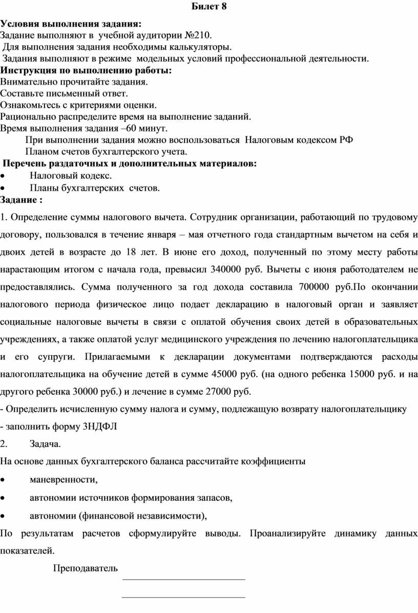 1. Определение суммы налогового вычета. Сотрудник организации, работающий по трудовому договору, пользовался в течение января – мая отчетного года стандартным вычетом на себя и двоих детей в возрасте до 18 лет. В июне его доход, полученный по этому месту работы нарастающим итогом с начала года, превысил 340000 руб. Вычеты с июня работодателем не предоставлялись. Сумма полученного за год дохода составила 700000 руб.По окончании налогового периода физическое лицо подает декларацию в налоговый орган и заявляет социальные налоговые вычеты в связи с оплатой обучения своих детей в образовательных учреждениях, а также оплатой услуг медицинского учреждения по лечению налогоплательщика и его супруги. Прилагаемыми к декларации документами подтверждаются расходы налогоплательщика на обучение детей в сумме 45000 руб. (на одного ребенка 15000 руб. и на другого ребенка 30000 руб.) и лечение в сумме 27000 руб.