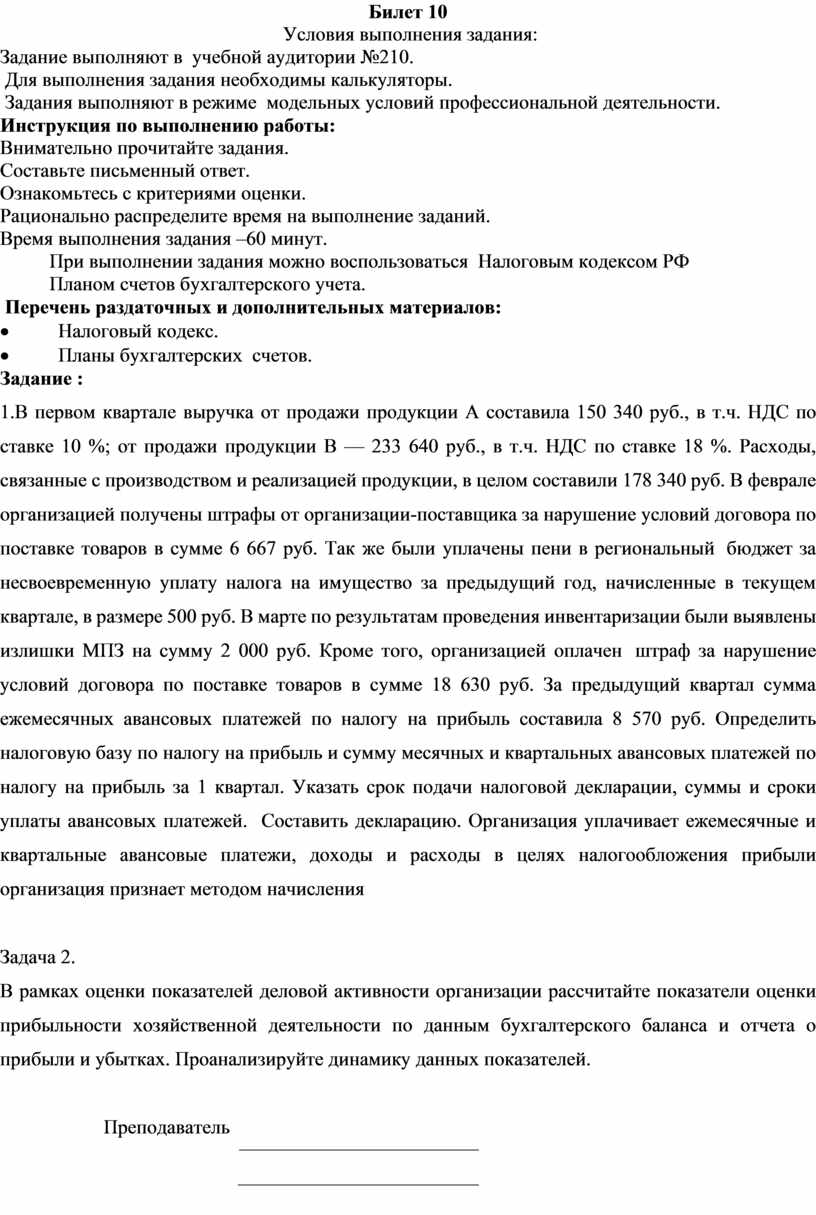 1.В первом квартале выручка от продажи продукции А составила 150 340 руб., в т.ч. НДС по ставке 10 %; от продажи продукции В — 233 640 руб., в т.ч. НДС по ставке 18 %. Расходы, связанные с производством и реализацией продукции, в целом составили 178 340 руб. В феврале организацией получены штрафы от организации-поставщика за нарушение условий договора по поставке товаров в сумме 6 667 руб. Так же были уплачены пени в региональный бюджет за несвоевременную уплату налога на имущество за предыдущий год, начисленные в текущем квартале, в размере 500 руб. В марте по результатам проведения инвентаризации были выявлены излишки МПЗ на сумму 2 000 руб. Кроме того, организацией оплачен штраф за нарушение условий договора по поставке товаров в сумме 18 630 руб. За предыдущий квартал сумма ежемесячных авансовых платежей по налогу на прибыль составила 8 570 руб. Определить налоговую базу по налогу на прибыль и сумму месячных и квартальных авансовых платежей по налогу на прибыль за 1 квартал. Указать срок подачи налоговой декларации, суммы и сроки уплаты авансовых платежей. Составить декларацию. Организация уплачивает ежемесячные и квартальные авансовые платежи, доходы и расходы в целях налогообложения прибыли организация признает методом начисления