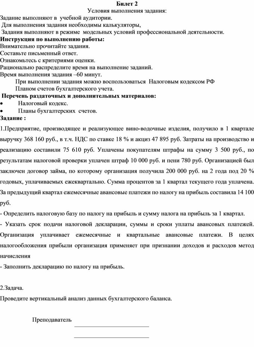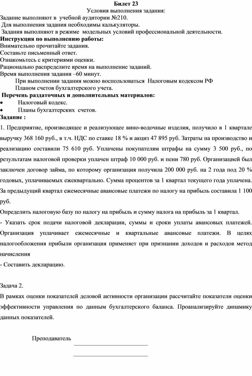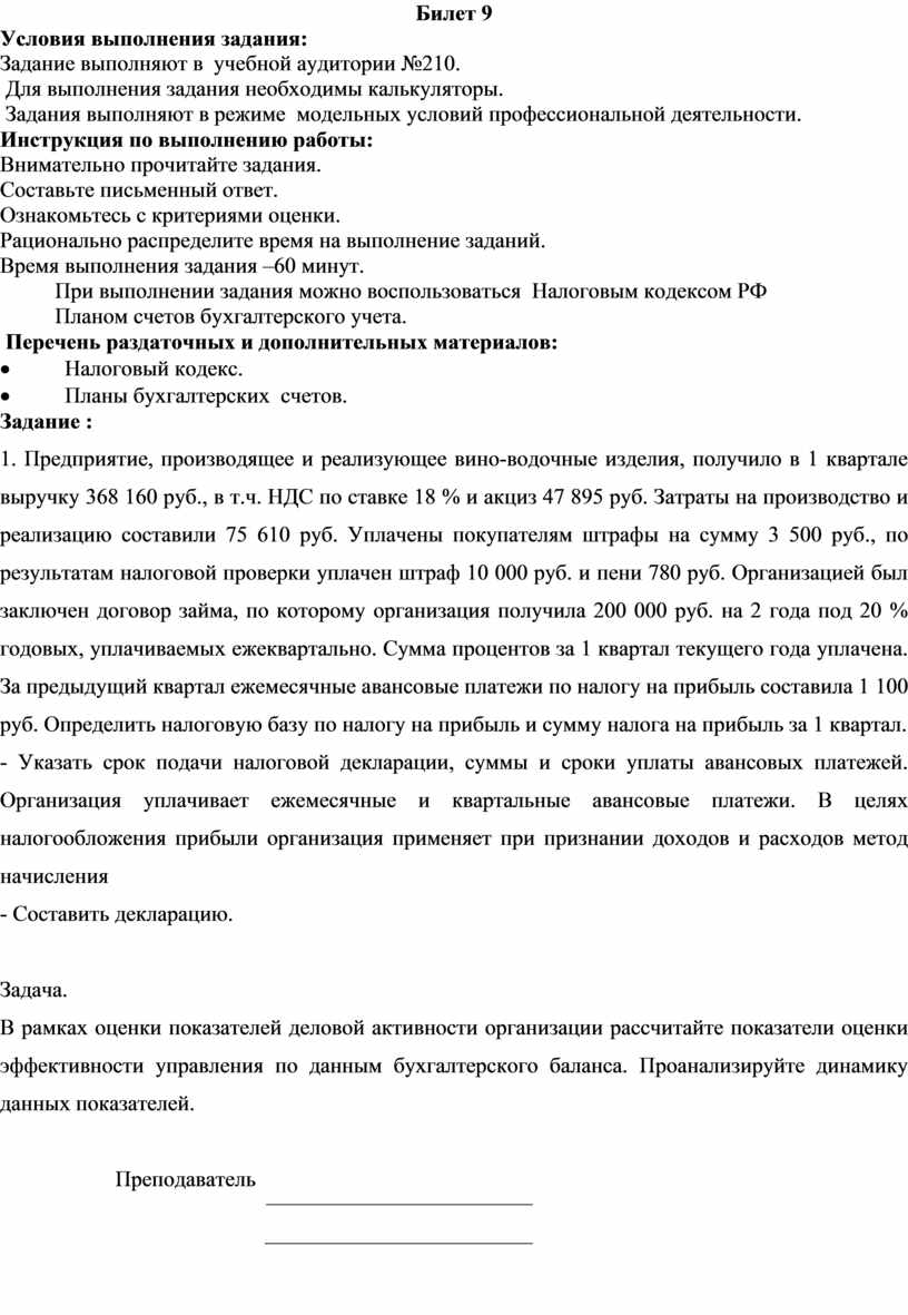 1.Предприятие, производящее и реализующее вино-водочные изделия, получило в 1 квартале выручку 368 160 руб., в т.ч. НДС по ставке 18 % и акциз 47 895 руб. Затраты на производство и реализацию составили 75 610 руб. Уплачены покупателям штрафы на сумму 3 500 руб., по результатам налоговой проверки уплачен штраф 10 000 руб. и пени 780 руб. Организацией был заключен договор займа, по которому организация получила 200 000 руб. на 2 года под 20 % годовых, уплачиваемых ежеквартально. Сумма процентов за 1 квартал текущего года уплачена. За предыдущий квартал ежемесячные авансовые платежи по налогу на прибыль составила 14 100 руб.
