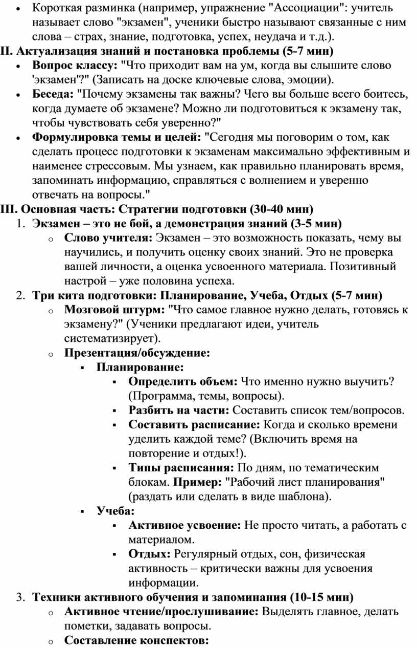 o Мозговой штурм: "Что самое главное нужно делать, готовясь к экзамену?" (Ученики предлагают идеи, учитель систематизирует).