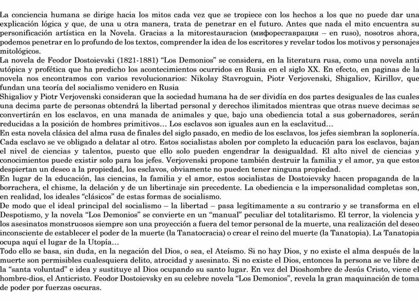 De modo que el ideal principal del socialismo – la libertad – pasa legítimamente a su contrario y se transforma en el Despotismo, y la novela “Los Demonios” se convierte en un “manual” peculiar del totalitarismo. El terror, la violencia y los asesinatos monstruosos siempre son una proyección a fuera del temor personal de la muerte, una realización del deseo inconsciente de establecer el poder de la muerte (la Tanatocracia) o crear el reino del muerte (la Tanatopia). La Tanatopia ocupa aquí el lugar de la Utopía…