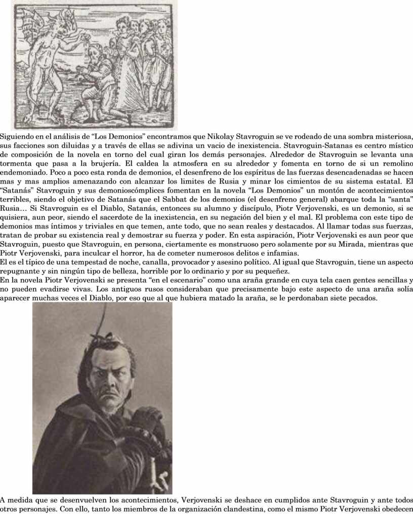 Siguiendo en el análisis de “Los Demonios” encontramos que Nikolay Stavroguin se ve rodeado de una sombra misteriosa, sus facciones son diluidas y a través de ellas se adivina un vacio de inexistencia. Stavroguin-Satanas es centro místico de composición de la novela en torno del cual giran los demás personajes. Alrededor de Stavroguin se levanta una tormenta que pasa a la brujería. El caldea la atmosfera en su alrededor y fomenta en torno de si un remolino endemoniado. Poco a poco esta ronda de demonios, el desenfreno de los espíritus de las fuerzas desencadenadas se hacen mas y mas amplios amenazando con alcanzar los limites de Rusia y minar los cimientos de su sistema estatal. El “Satanás” Stavroguin y sus demonioscómplices fomentan en la novela “Los Demonios” un montón de acontecimientos terribles, siendo el objetivo de Satanás que el Sabbat de los demonios (el desenfreno general) abarque toda la “santa” Rusia… Si Stavroguin es el Diablo, Satanás, entonces su alumno y discípulo, Piotr Verjovenski, es un demonio, si se quisiera, aun peor, siendo el sacerdote de la inexistencia, en su negación del bien y el mal. El problema con este tipo de demonios mas íntimos y triviales en que temen, ante todo, que no sean reales y destacados. Al llamar todas sus fuerzas, tratan de probar su existencia real y demostrar su fuerza y poder. En esta aspiración, Piotr Verjovenski es aun peor que Stavroguin, puesto que Stavroguin, en persona, ciertamente es monstruoso pero solamente por su Mirada, mientras que Piotr Verjovenski, para inculcar el horror, ha de cometer numerosos delitos e infamias.