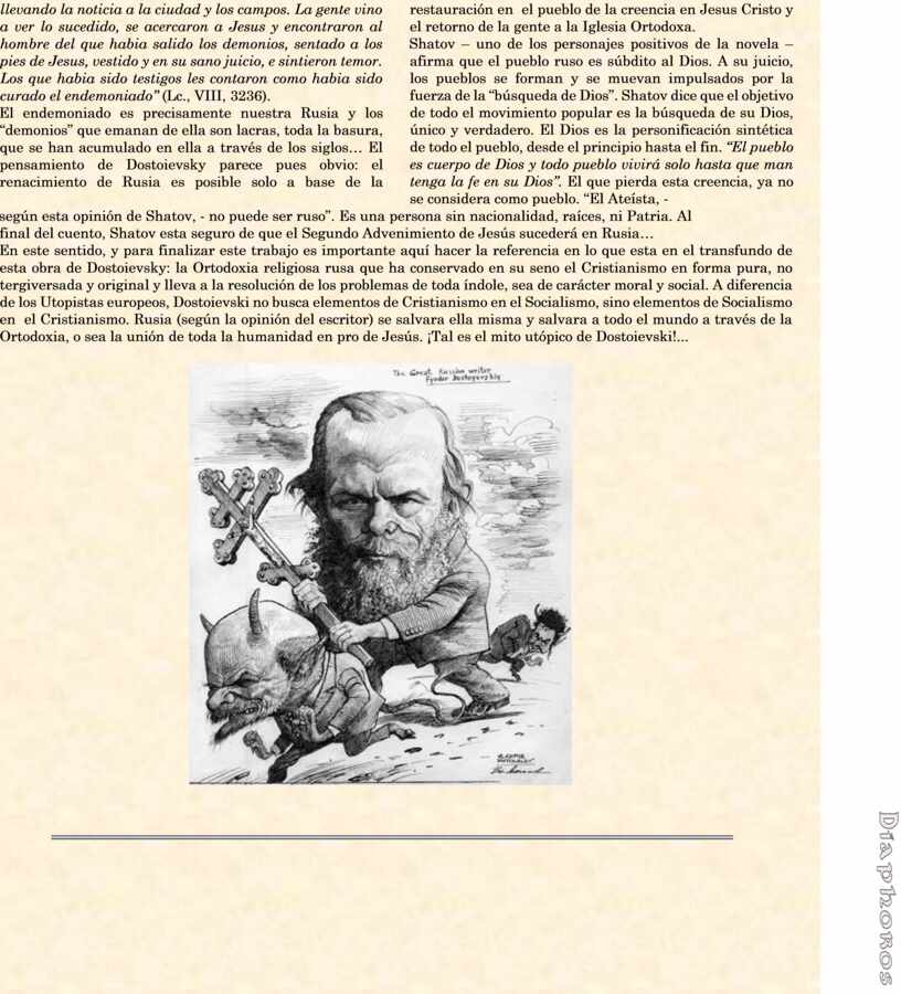 El endemoniado es precisamente nuestra Rusia y los “demonios” que emanan de ella son lacras, toda la basura, que se han acumulado en ella a través de los siglos… El pensamiento de Dostoievsky parece pues obvio: el renacimiento de Rusia es posible solo a base de la restauración en el pueblo de la creencia en Jesus Cristo y el retorno de la gente a la Iglesia Ortodoxa.
