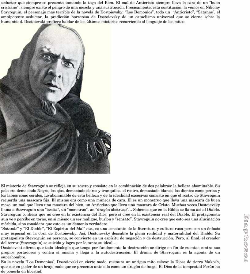 “Satanás” y “El Diablo”, “El Espíritu del Mal” etc., es una constante de la literatura y cultura rusa pero con un énfasis muy especial en la obra de Dostoievsky. Así, Dostoievsky descubre la plena realidad y materialidad del Diablo. Su protagonista Stevroguin en persona, se convierte en un espíritu de negación y de destrucción. Pero, al final, el creador del terror (Stavroguin) se suicida y logra por lo tanto su ideal…