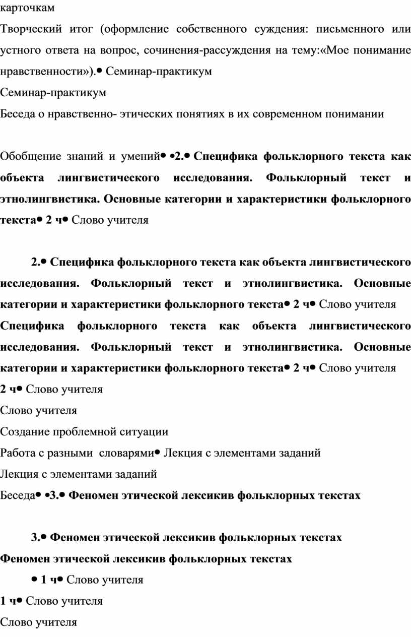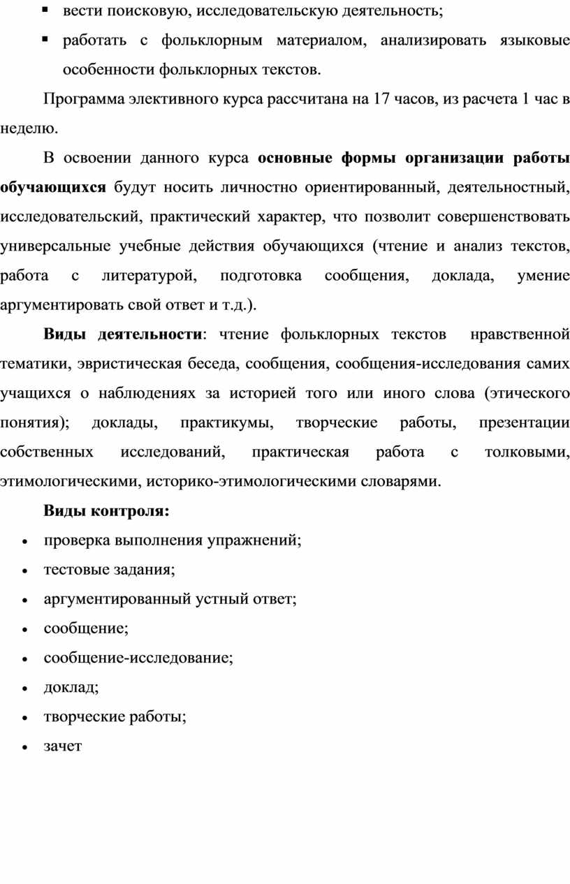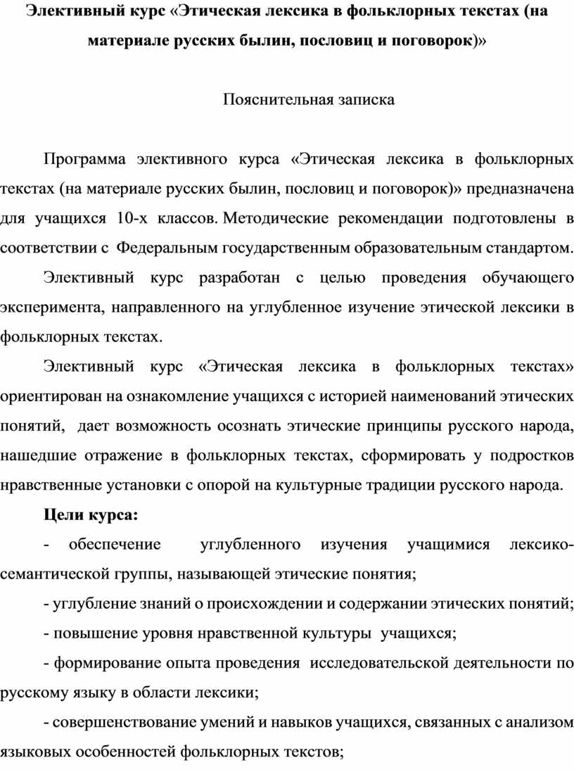Элективный курс разработан с целью проведения обучающего эксперимента, направленного на углубленное изучение этической лексики в фольклорных текстах.