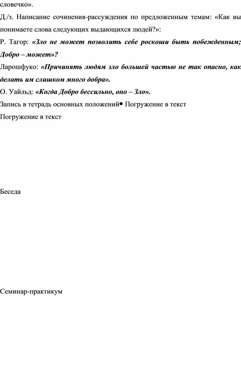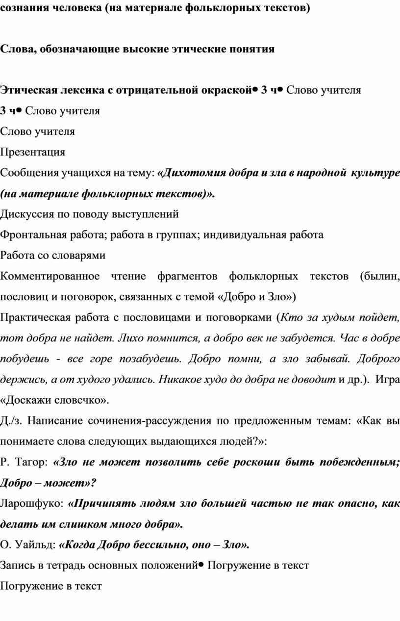 Слово учителя Презентация Сообщения учащихся на тему: «Дихотомия добра и зла в народной культуре (на материале фольклорных текстов)». Дискуссия по поводу выступлений Фронтальная работа; работа в группах; индивидуальная работа Работа со словарями Комментированное чтение фрагментов фольклорных текстов (былин, пословиц и поговорок, связанных с темой «Добро и Зло») Практическая работа с пословицами и поговорками (Кто за худым пойдет, тот добра не найдет. Лихо помнится, а добро век не забудется. Час в добре побудешь - все горе позабудешь. Добро помни, а зло забывай. Доброго держись, а от худого удались. Никакое худо до добра не доводит и др.). Игра «Доскажи словечко». Д./з. Написание сочинения-рассуждения по предложенным темам: «Как вы понимаете слова следующих выдающихся людей?»: Р. Тагор: «Зло не может позволить себе роскоши быть побежденным; Добро – может»? Ларошфуко: «Причинять людям зло большей частью не так опасно, как делать им слишком много добра». О. Уайльд: «Когда Добро бессильно, оно – Зло». Запись в тетрадь основных положений |