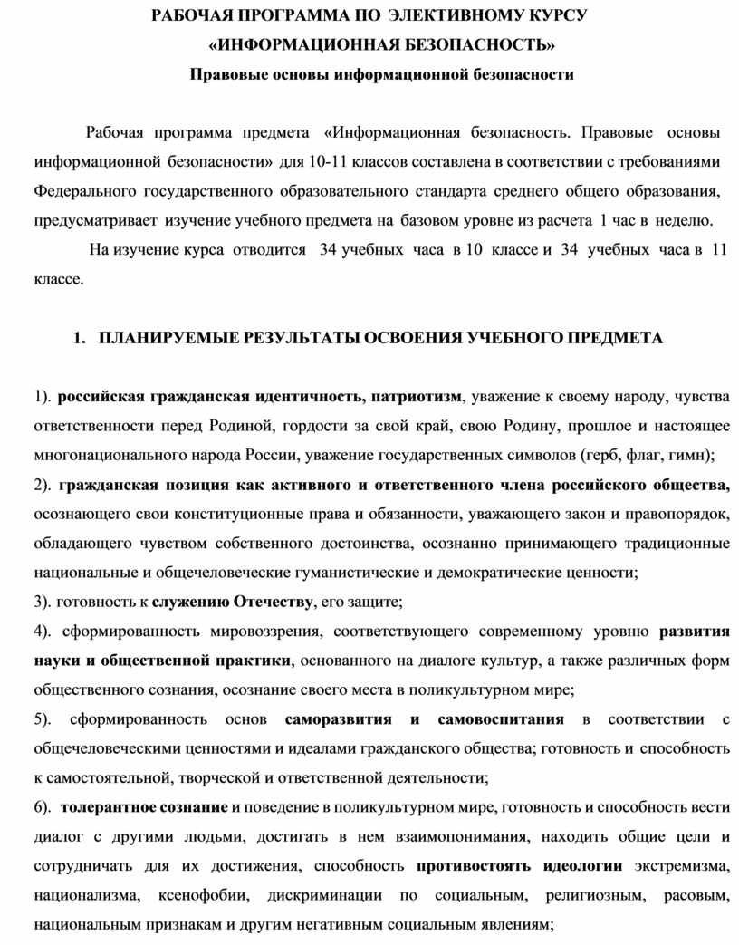 Рабочая программа предмета «Информационная безопасность. Правовые основы информационной безопасности» для 10-11 классов составлена в соответствии с требованиями Федерального государственного образовательного стандарта среднего общего образования, предусматривает изучение учебного предмета на базовом уровне из расчета 1 час в неделю.