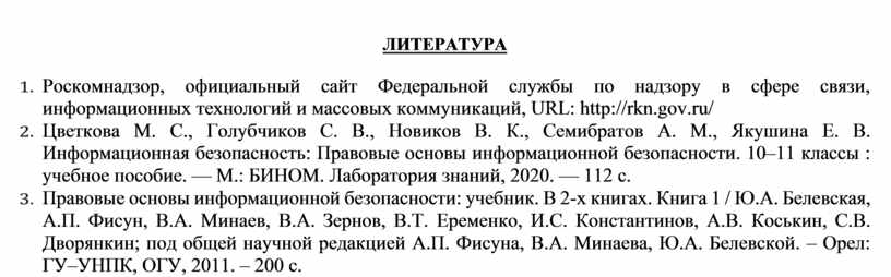2. Цветкова М. С., Голубчиков С. В., Новиков В. К., Семибратов А. М., Якушина Е. В. Информационная безопасность: Правовые основы информационной безопасности. 10–11 классы : учебное пособие. — М.: БИНОМ. Лаборатория знаний, 2020. — 112 с.
