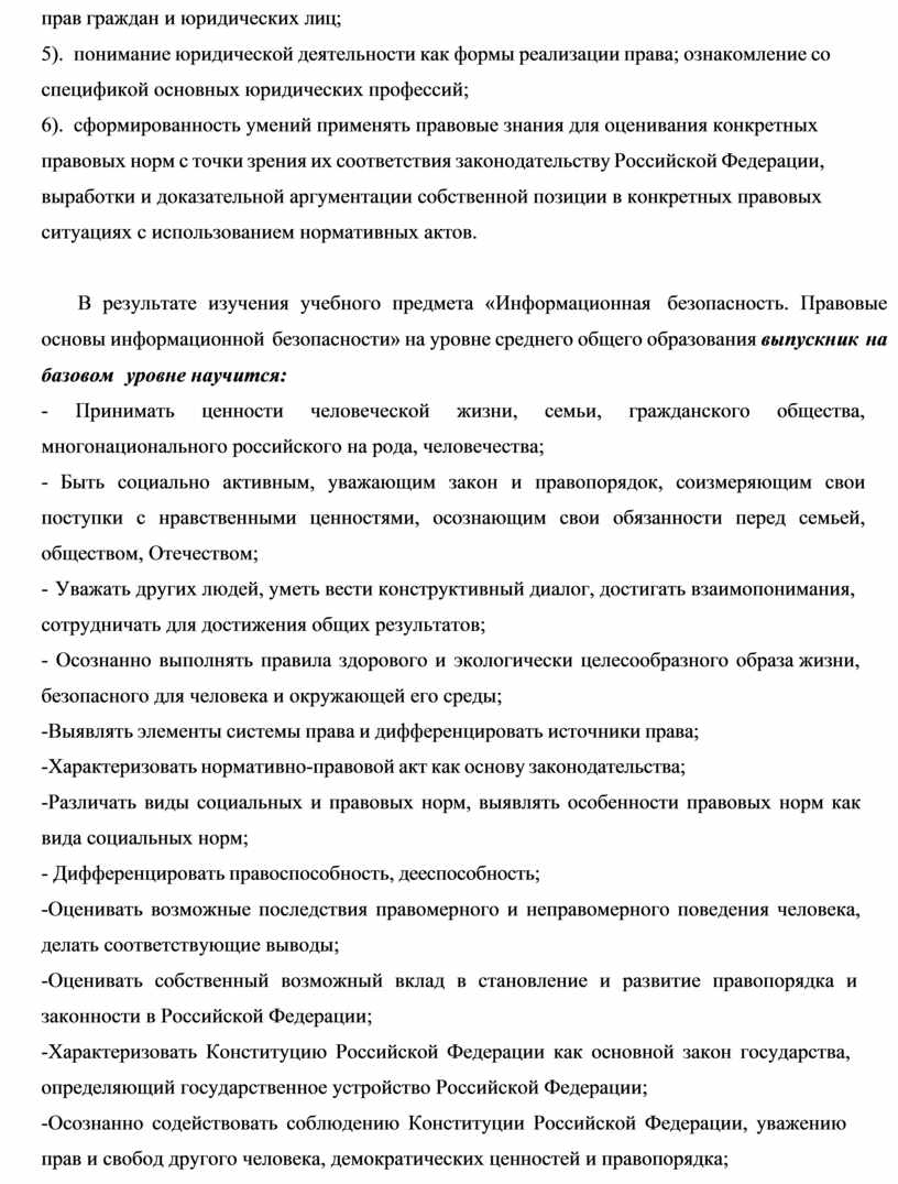 В результате изучения учебного предмета «Информационная безопасность. Правовые основы информационной безопасности» на уровне среднего общего образования выпускник на базовом уровне научится: