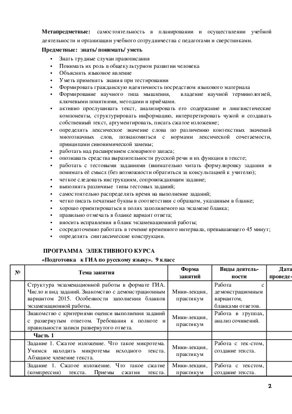 Рабочая программа элективного курса «Подготовка к ГИА по русскому языку»