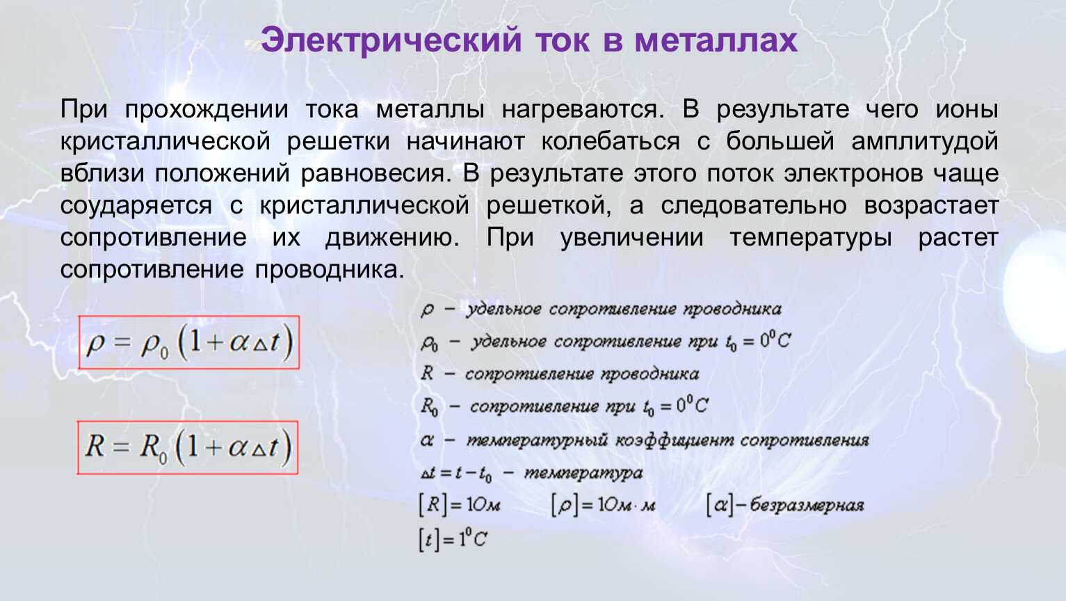 При прохождении тока металлы нагреваются. В результате чего ионы кристаллической решетки начинают колебаться с большей амплитудой вблизи положений равновесия. В результате этого поток электронов чаще соударяется с кристаллической решеткой, а следовательно возрастает сопротивление их движению. При увеличении температуры растет сопротивление проводника.