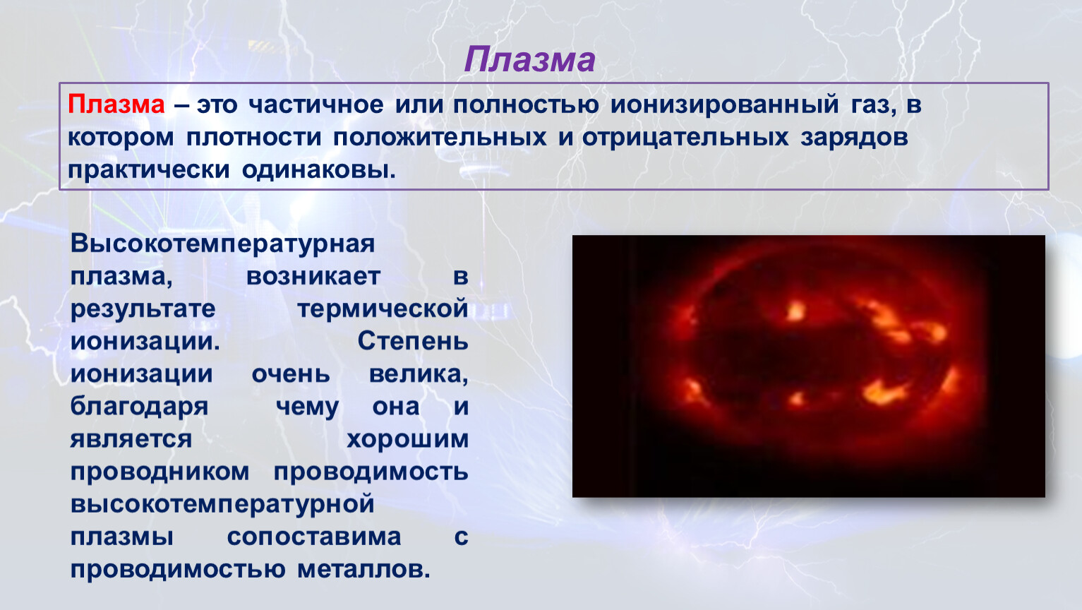 Высокотемпературная плазма, возникает в результате термической ионизации. Степень ионизации очень велика, благодаря чему она и является хорошим проводником проводимость высокотемпературной плазмы сопоставима с проводимостью металлов.